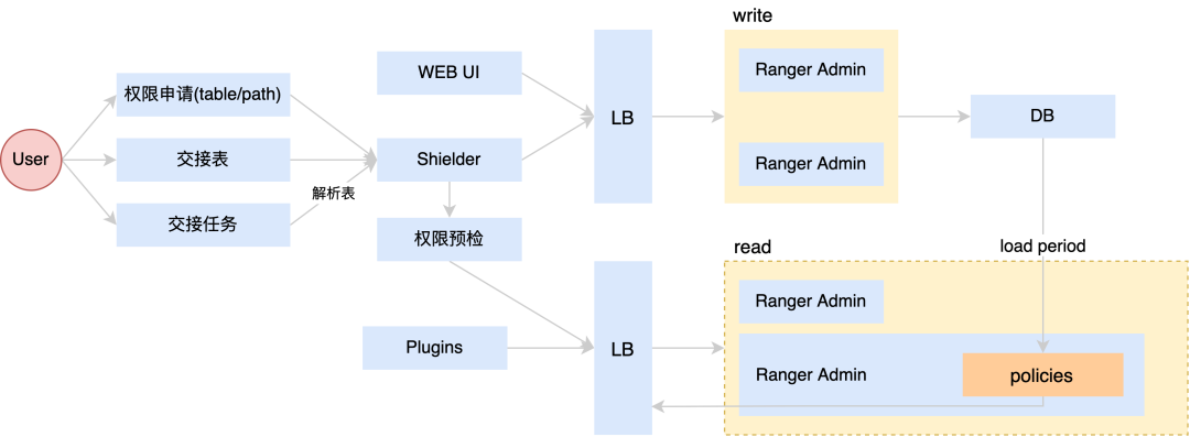 我们使用的Ranger是基于1.2.0版本改造的,部署了2台写节点和2台读节点并接入公司的负载均衡系统来实现读写分离,用户在申请Hive表或者HDFS path,交接表或者交接任务时,会发送请求给Shielder(Shielder是工具侧的授权服务),授权时接入写节点的LB,shielder会通过LB调用Ranger Admin的REST API进行权限操作,Ranger Admin将相关policy持久化到DB,赋权完成后Shielder还会通过LB调用读节点的REST API进行权限预检,预检通过后用户申请权限的流程就结束了。